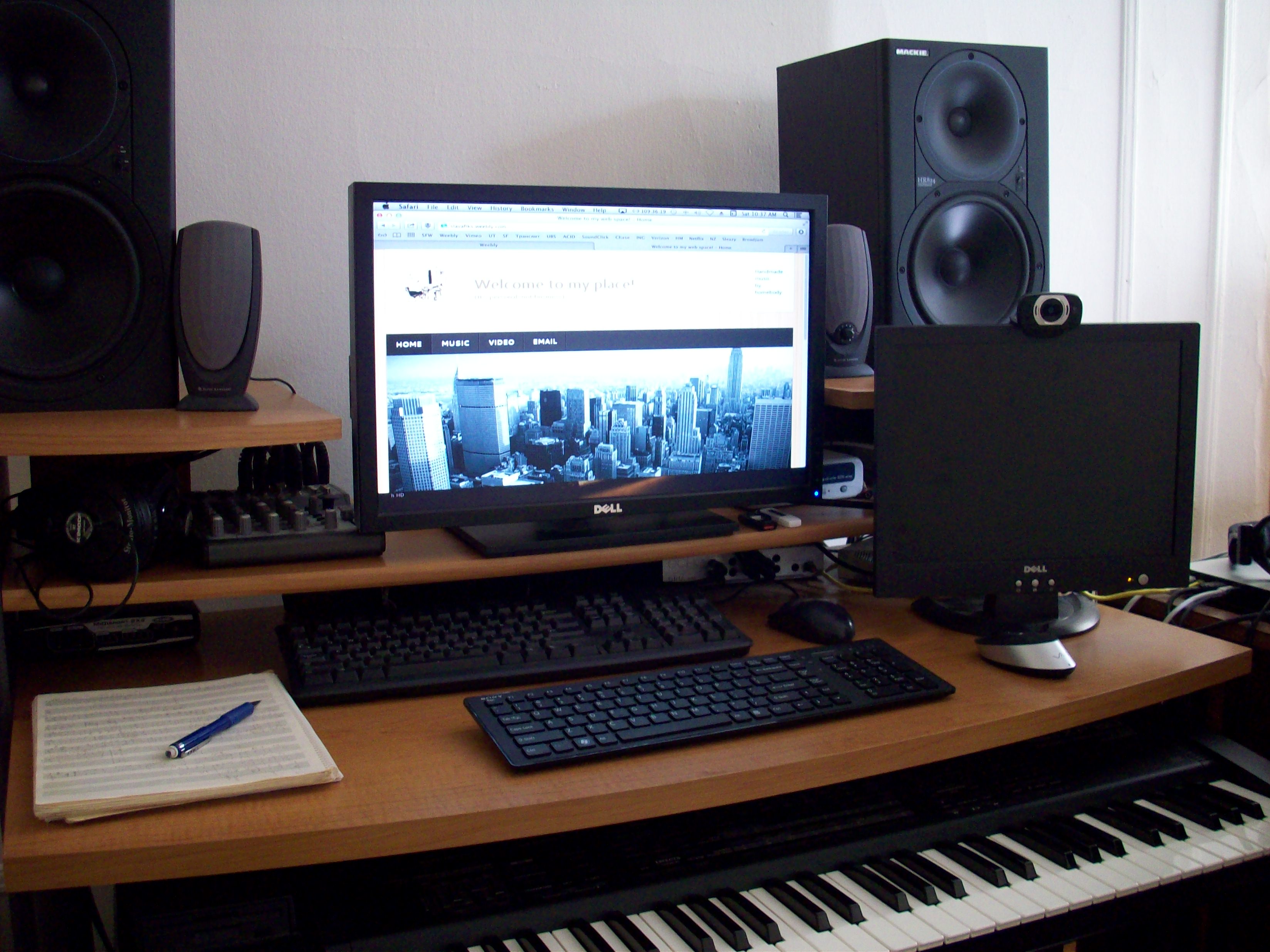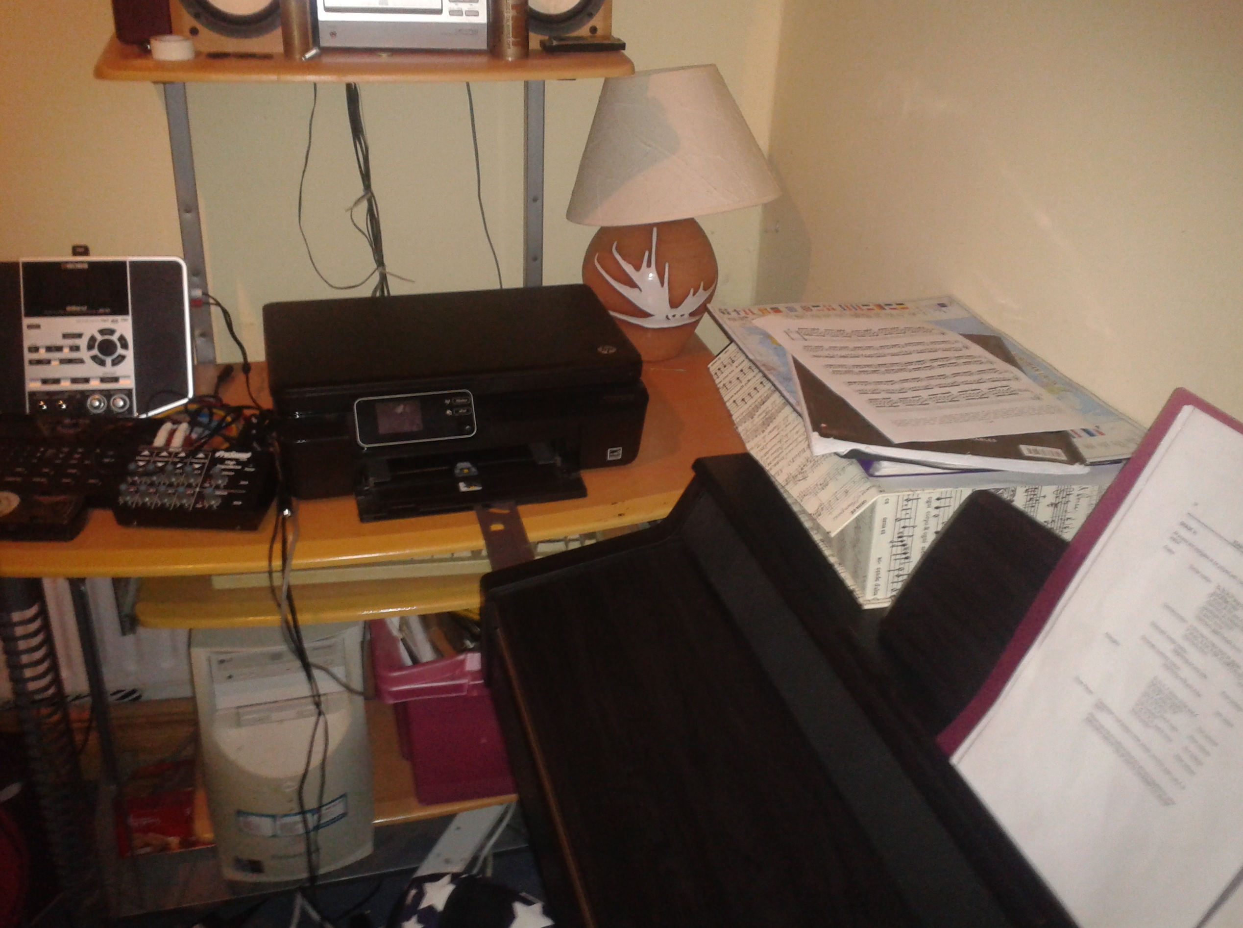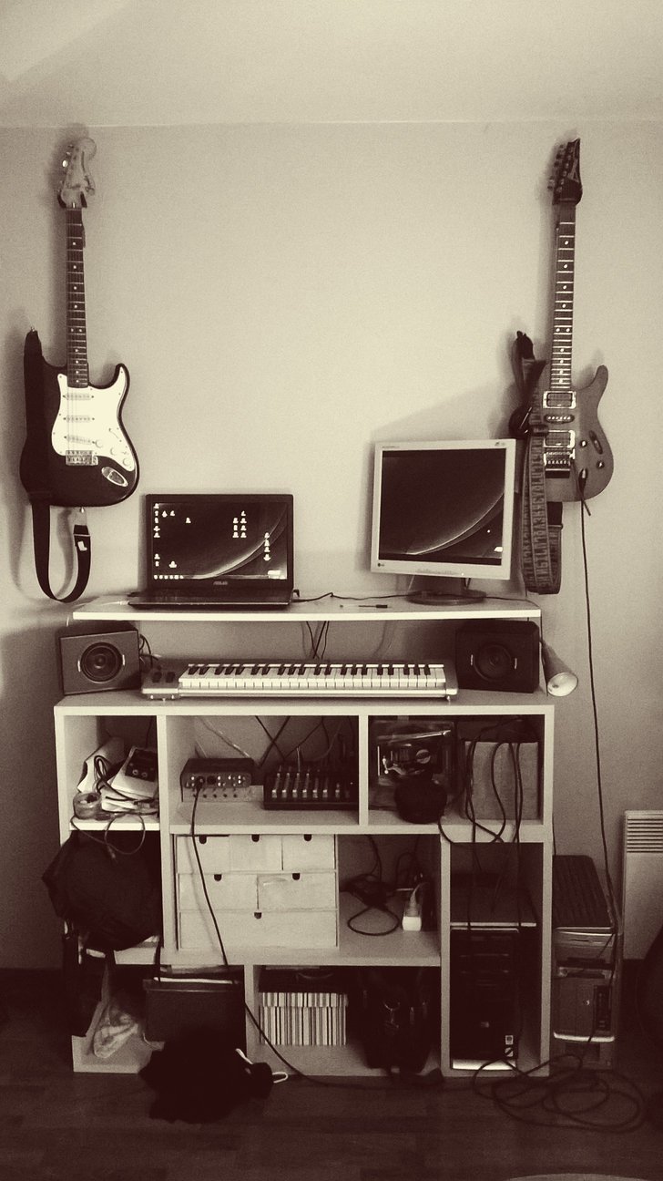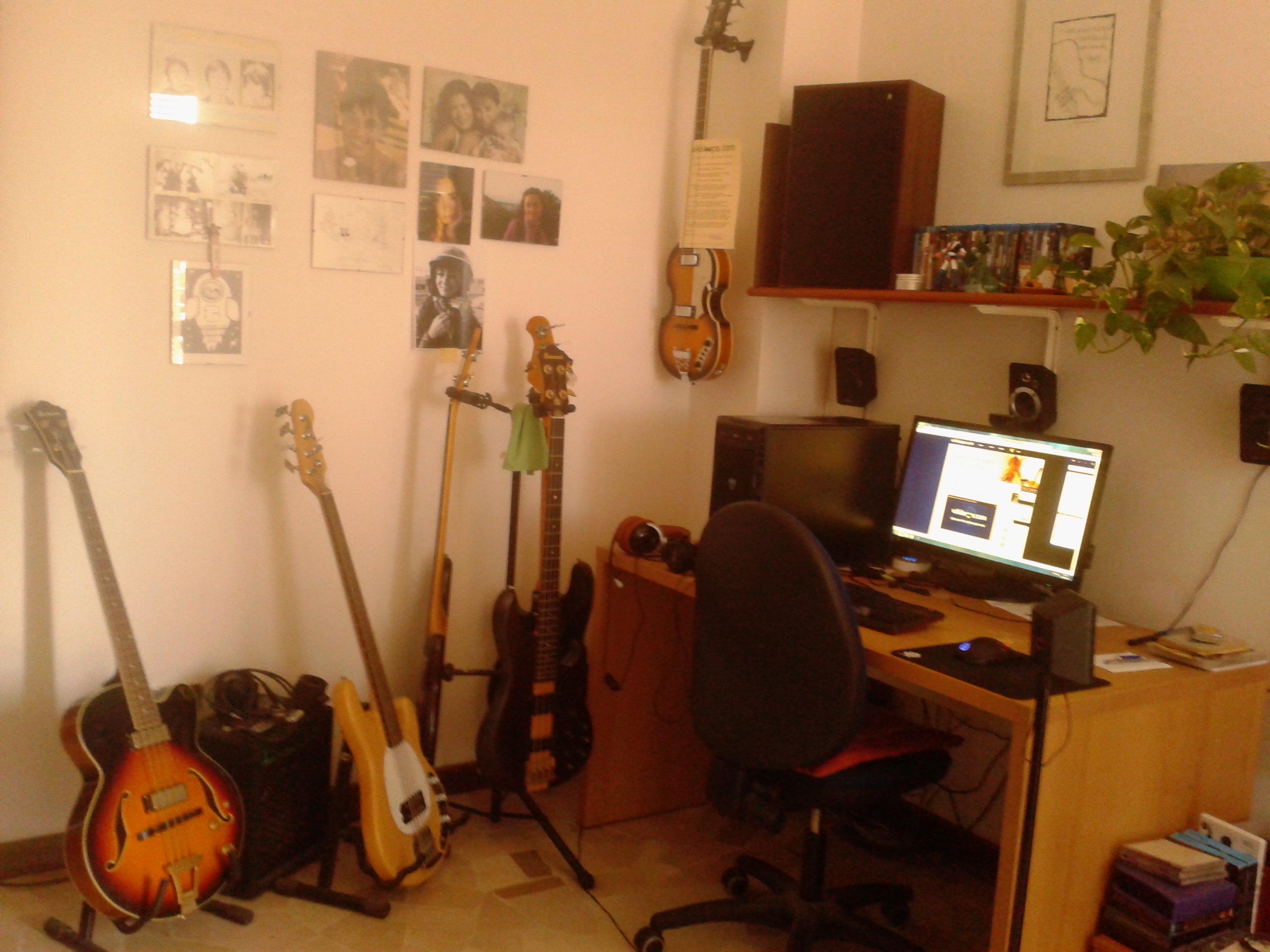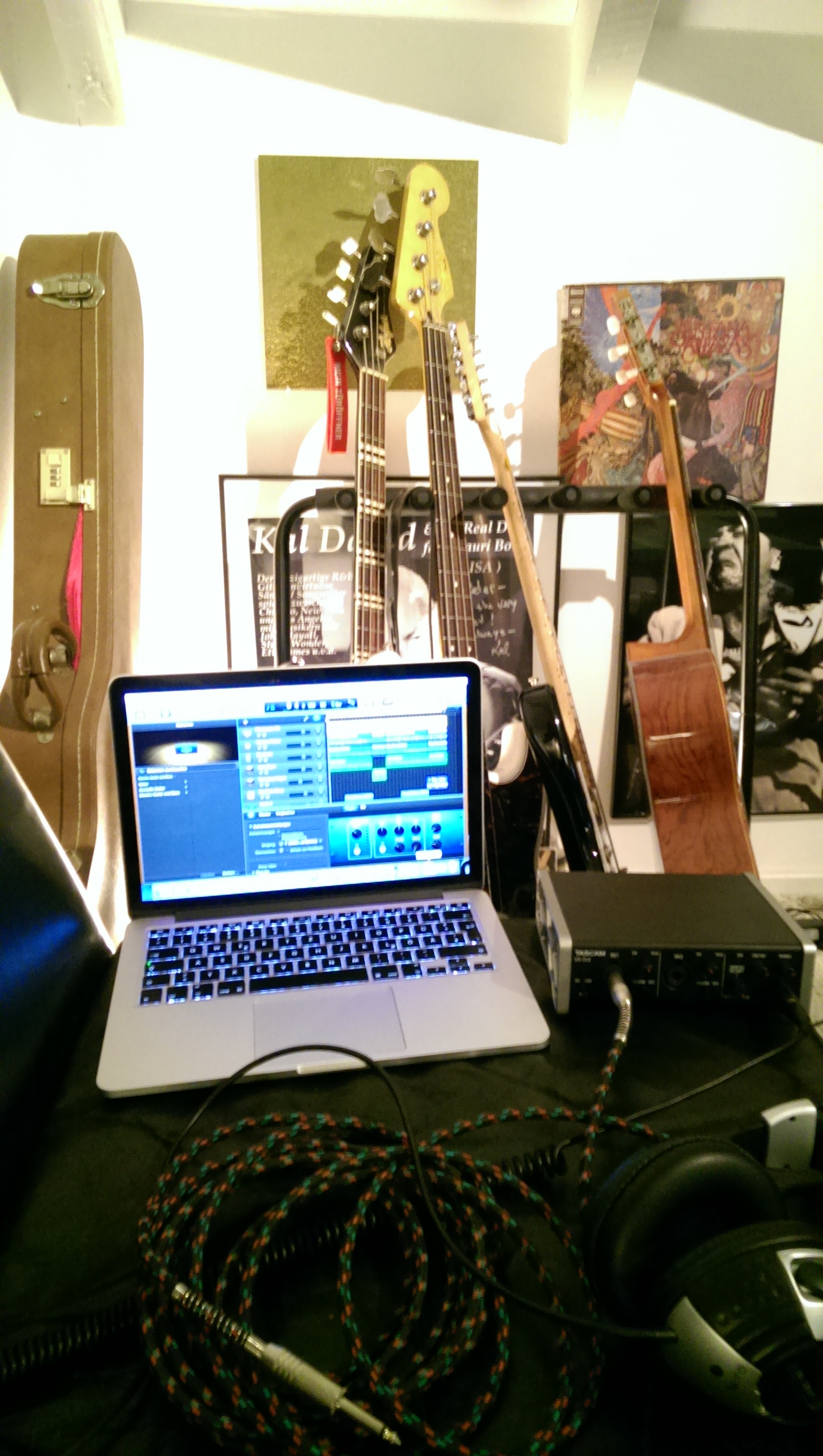 On the operating table you will spot a Boss JS-10 that I do all my guitar recording on, a Zoom B3 for the bass, Kurzweil keyboards, and in my "trophy cabinet" my Les Paul, Ernie Ball Silhouette special and Jazz bass....