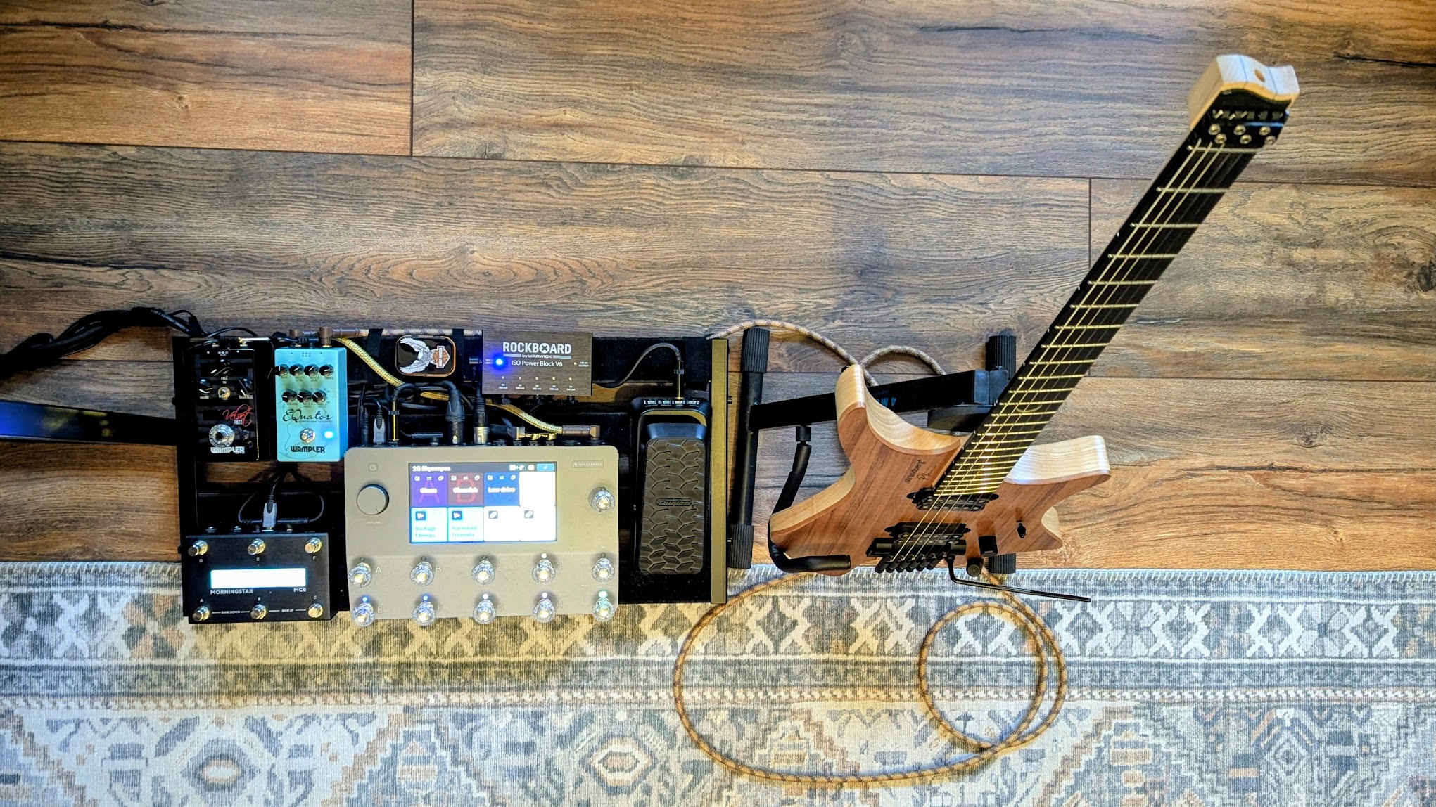Posts frequency stretches over millennia on this forum so 10 years later is not much. This is my current rig, my lovely .Strandberg Boden Plini Edition Neck-Thru. And my Quad Cortex with some analogue pedals going into a Fender Tone Master FR-10. All that is hooked up via a Focusrite to my (Linux) Manjaro PC on which I do all the recording and stuff.